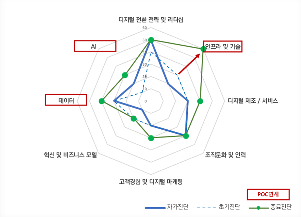 | 08 AI | AI를 업무와 서비스에 적용하여 경쟁력을 강화하고 자율적 의사결정을 지원하는 수준을 평가합니다. |